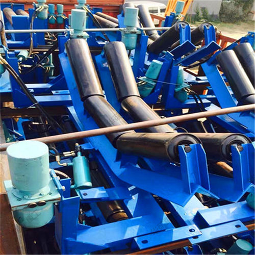 液壓糾偏裝置是由檢驅(qū)輪、油泵、復(fù)合油缸、油管、固定支架構(gòu)成。當(dāng)皮帶運(yùn)行跑偏時(shí),皮帶和檢驅(qū)輪接觸,檢驅(qū)輪帶動(dòng)油泵旋轉(zhuǎn),輸出液壓油控制驅(qū)動(dòng)油缸往復(fù)運(yùn)動(dòng),帶動(dòng)調(diào)心托輥偏轉(zhuǎn),使調(diào)心托輥的線運(yùn)動(dòng)方向與皮帶的運(yùn)動(dòng)方向形成。