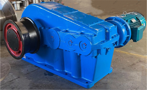 該絞車為無機繩摩擦式傳動,與導向輪、托滾、壓滾、滑車等輔機配套組成列車系統(tǒng)。調(diào)車絞車系統(tǒng)可以實現(xiàn)正反雙向重載牽車。絞車由電動機、聯(lián)軸器、制動器、減速器以及摩擦輪等幾部件分組成。電機采用變頻電機,配以變頻電控柜,可以實現(xiàn)無機變速,重載時采用低速恒扭矩啟動、頻率在5~50H范圍內(nèi)可調(diào),空載時采用高速恒功率運行、使絞車運行速度快、效率高、頻率在50~80Hz范圍內(nèi)可調(diào)。減速器采用雙圓弧齒輪傳動,具有傳動比大、體積小、傳動效率高、噪音低、承載能力強等優(yōu)點。