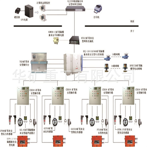 KJ416礦用水泵監(jiān)控系統(tǒng)主要由KXJ14×10/660隔爆兼本安型PLC控制箱、TH24礦用本安型操作臺、CXH18礦用本安型操作箱、監(jiān)控計算機及軟件、打印機、不間斷電源、多協(xié)議網(wǎng)關、多種傳感器及傳輸設備組成。