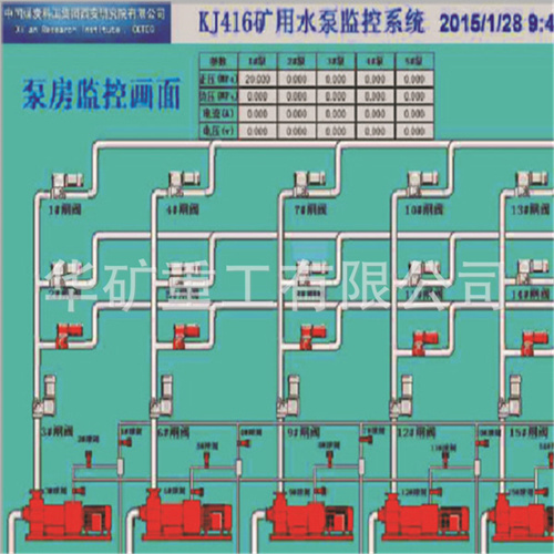 KJ416礦用水泵監(jiān)控系統(tǒng)是一套可對礦井水泵抽排水進行集中監(jiān)控并能實現(xiàn)遠程實時監(jiān)控的現(xiàn)代化控制系統(tǒng),該系統(tǒng)解決了現(xiàn)有礦井排水系統(tǒng)開泵程序繁瑣,發(fā)生透水事故時無人開啟備用水泵,系統(tǒng)故障以及排水效率低下等問題。本系統(tǒng)通過各種先進可靠的傳感器、保護器、電動閘(球)閥、監(jiān)控電視等監(jiān)測煤礦井下排水系統(tǒng)各設備的工作狀態(tài),實現(xiàn)井下水位、水壓、水泵排水系統(tǒng)的自動監(jiān)控,及時發(fā)現(xiàn)系統(tǒng)存在的隱患與故障點。此外,將監(jiān)測到的數(shù)據(jù)實時通過光纖上傳至地面上位系統(tǒng)可方便實現(xiàn)井下泵房遠程控制。該系統(tǒng)與KJ117礦井水文監(jiān)測系統(tǒng)的聯(lián)動,可以實時監(jiān)控礦井上下水文觀測孔水壓、水溫、流量以及采空區(qū)水位,排水明渠等水文參數(shù),通過多種傳感器的實時監(jiān)測可實現(xiàn)對煤礦透水事故的預警,事故通過井下光纜將數(shù)據(jù)傳輸至生產(chǎn)調(diào)度中心監(jiān)控平臺,系統(tǒng)預留井下通訊接口,并以指揮井下人員在發(fā)生透水事故時的緊急撤離,為及時啟動礦井水災應急救援和最大限度地保證煤礦安全生產(chǎn)提供可靠技術手段。