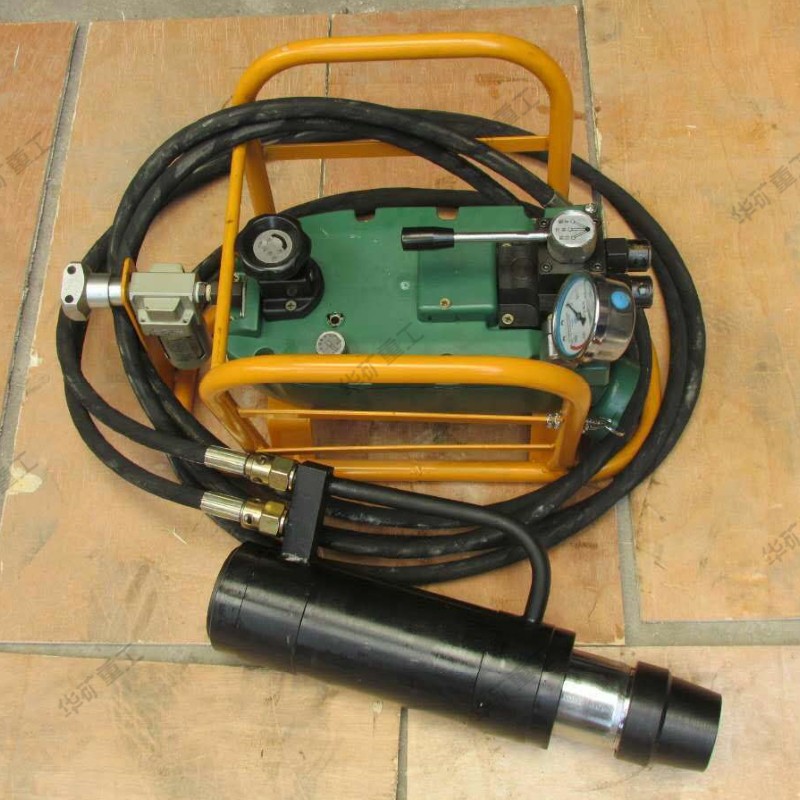 錨索張拉機具由張拉千斤頂、QYB-55型氣動液壓泵以及高壓膠管等組成,構(gòu)成一組煤礦巷道錨索預(yù)應(yīng)力張拉安裝的工具。張拉千斤頂內(nèi)置工具錨,不但實現(xiàn)自動錨固和自動退錨,而且保證了操作安全,提高了工作效率。