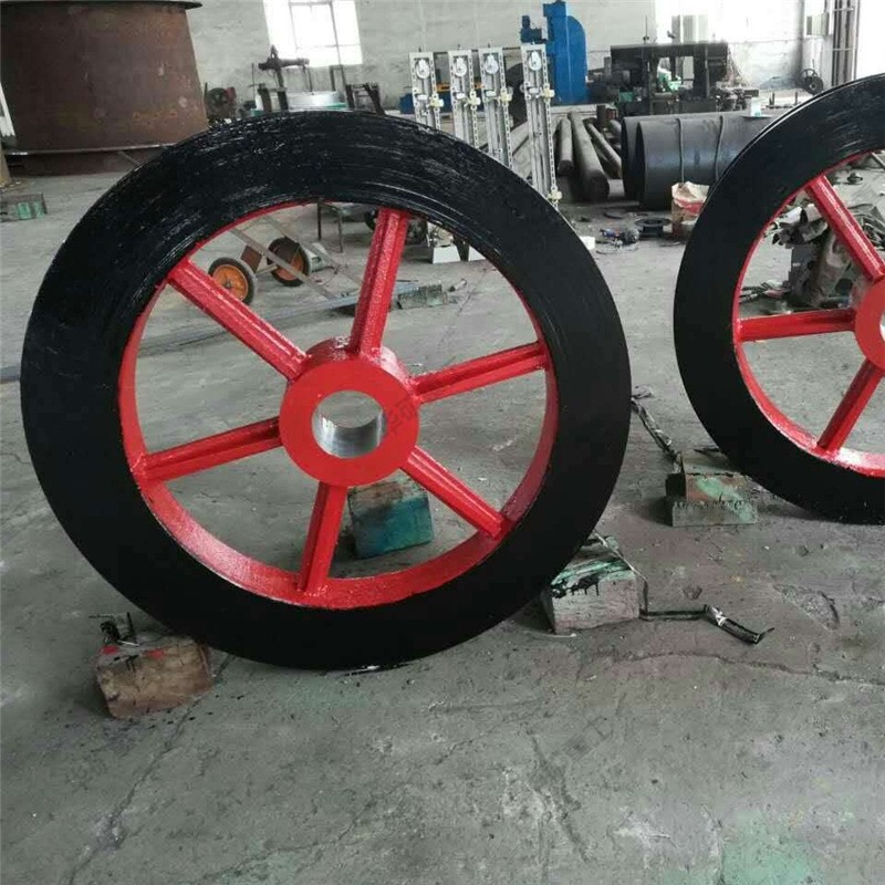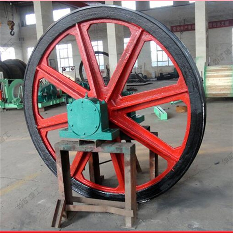 天輪安裝在井架上,作支撐,供礦井提升時(shí)支拖提升機(jī)卷筒到提升容器之間,引導(dǎo)鋼絲繩轉(zhuǎn)向之用。繩槽帶塑襯或膠塊,增加鋼絲繩的使用壽命。